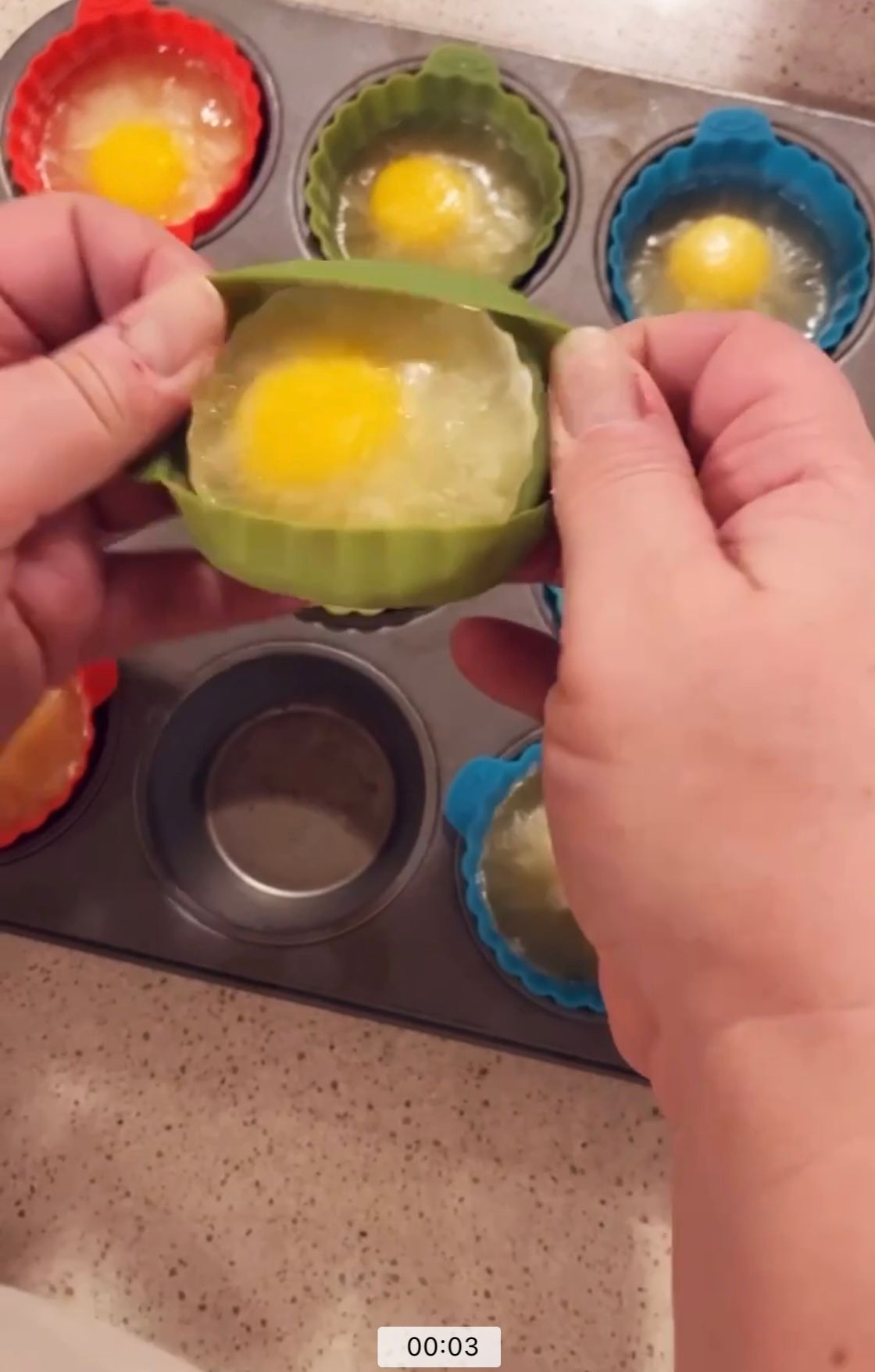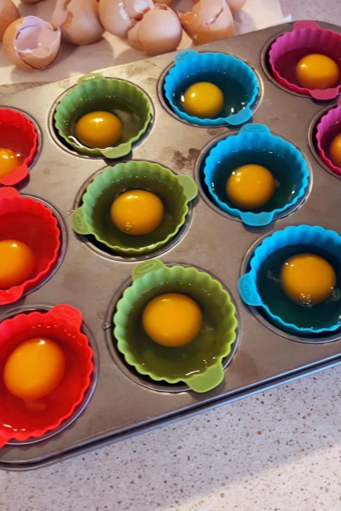 The first time tried to freeze eggs, I cracked them directly into the muffin pan thinking I would be able to twist it and pop them out like ice cubes from an ice cube tray. I was wrong! They were very hard to get out intact. They also started to thaw pretty quickly, especially with the body heat from my fingers with all the extra handling, and the project turned into a slippery, slimy mess!