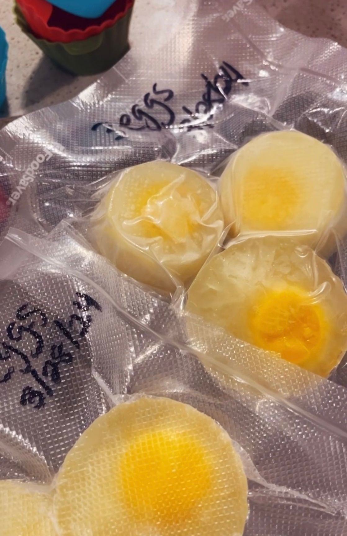 Once the eggs are frozen, pull the muffin pan out of the freezer and pop each egg out of its cup. Package them up, vacuum seal them, and put them back in the freezer.